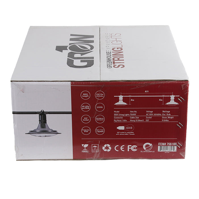 100' Greenhouse Expandable String Lights 14AWG w/ 12W LED 6500K Grow LED Bulbs (24 bulbs)
