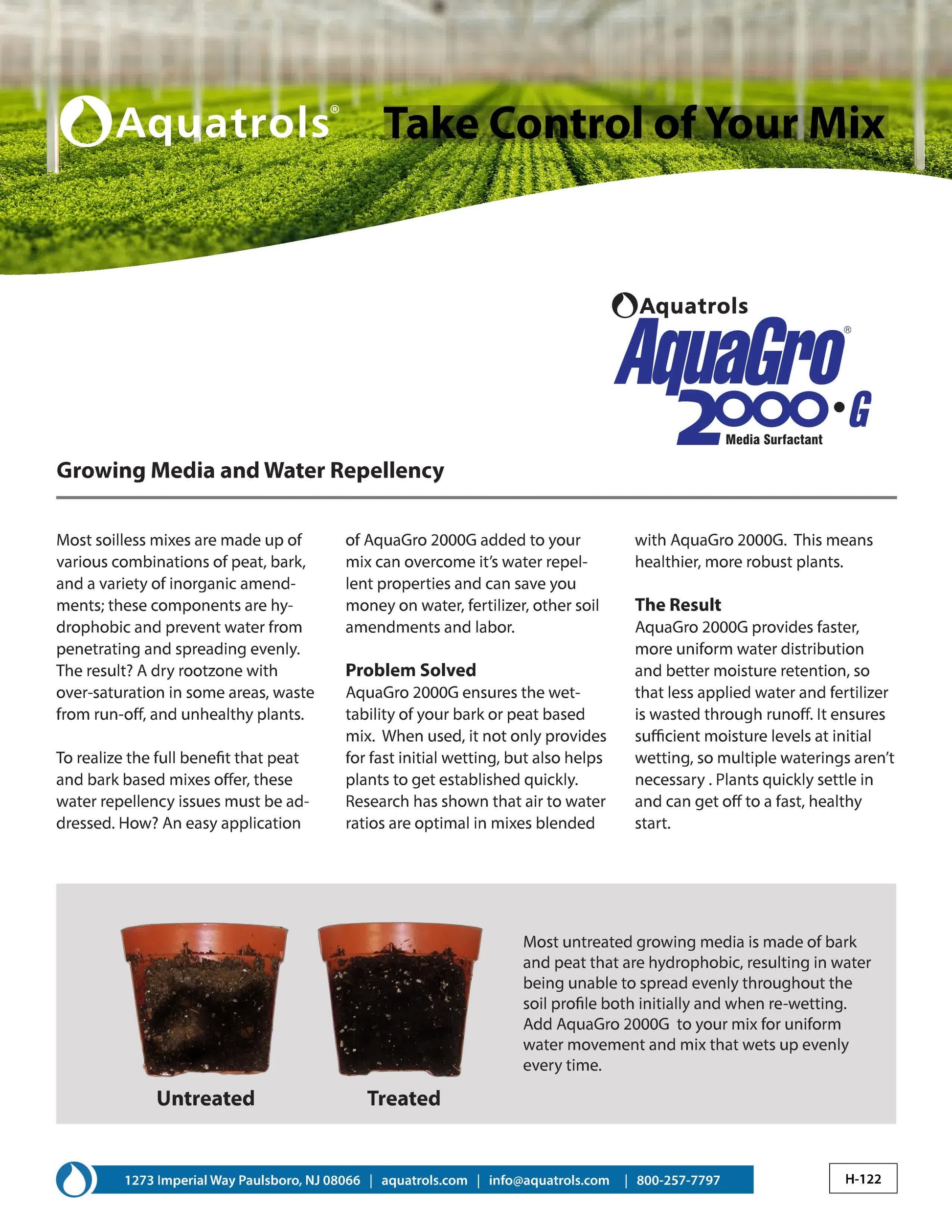 AquaGro 2000 G media surfactant helps you overcome water repellency and control the moisture in your mix. AquaGro 2000 G blends easily in all types of mixes and allows water to flow uniformly.