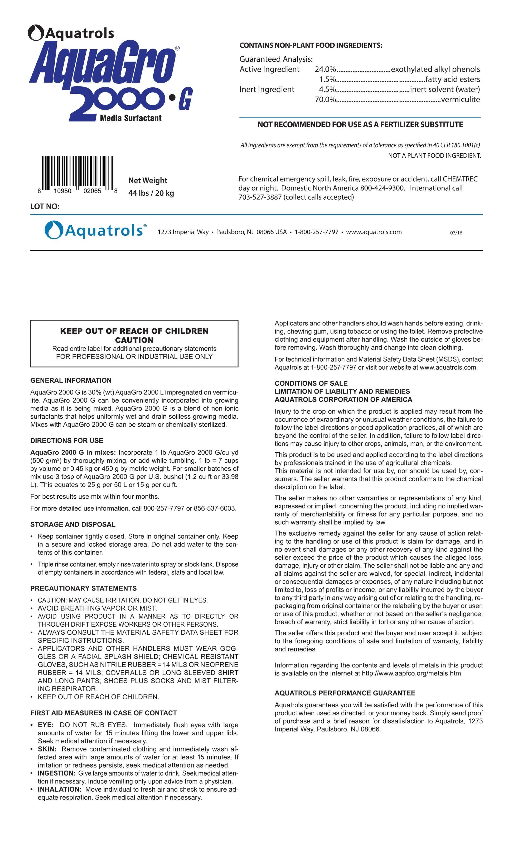 - Aqua-Gro 2000 Granular should be incorporated at 1/2 to 1 lb. per cubic yard to ensure quick and easy initial wetting of soilless media.
