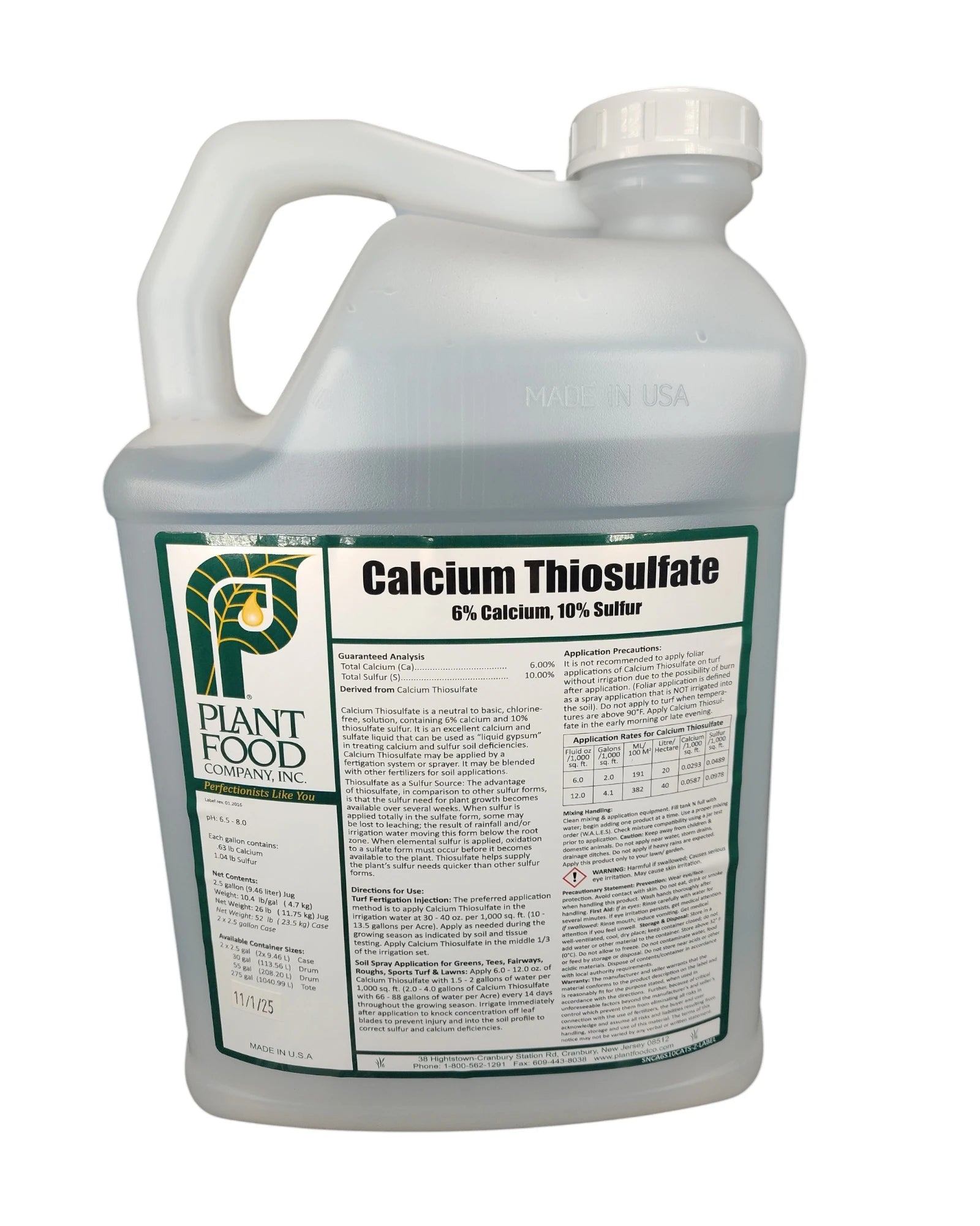 Plant Food Co. Calcium Thiosulfate is a neutral-to-basic, chlorine-free liquid solution delivering 6% calcium and 10% thiosulfate sulfur in a single, fully compatible input. Functionally equivalent to liquid gypsum, it corrects calcium and sulfur deficiencies faster than dry amendments — without disrupting soil pH or clogging drip lines.